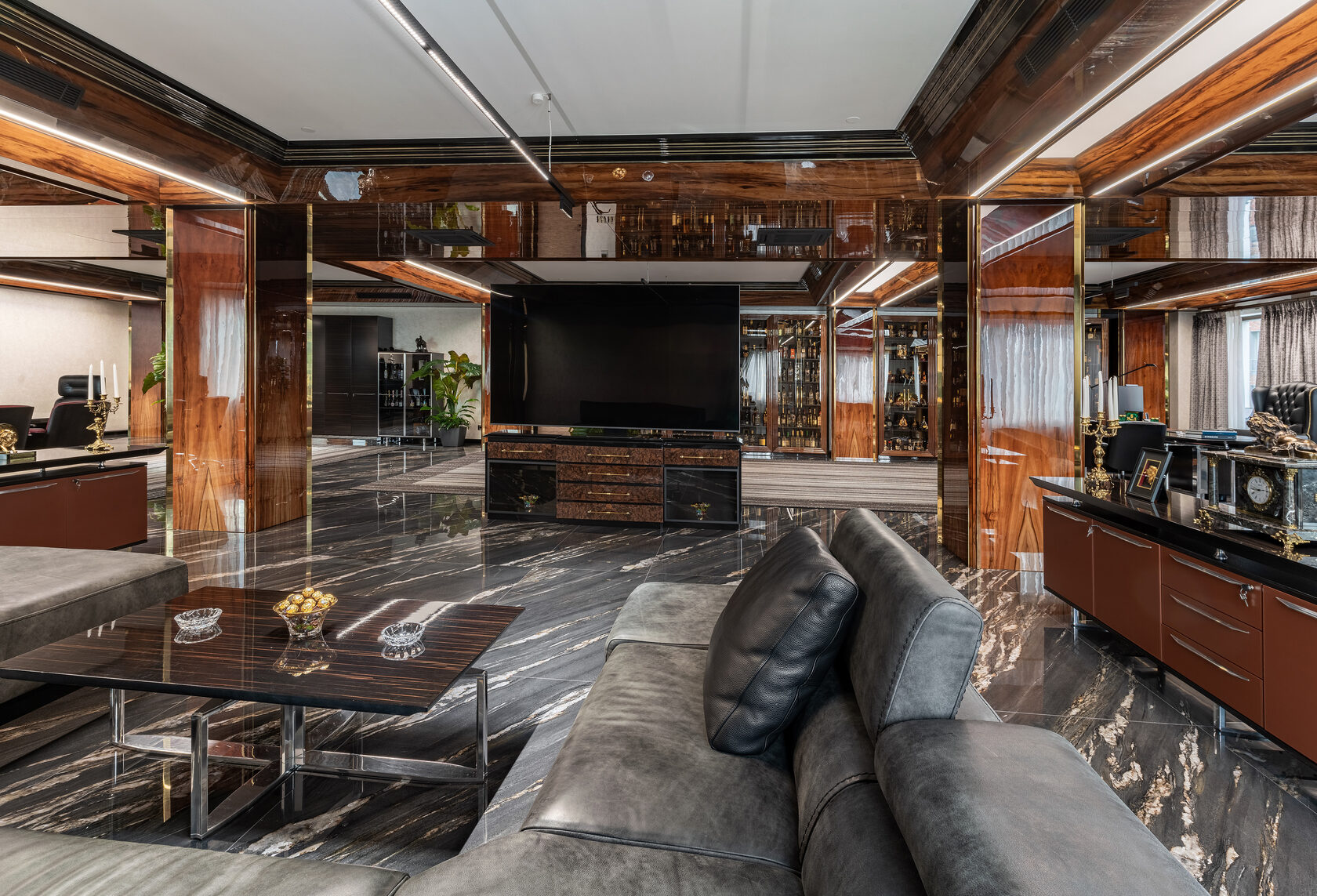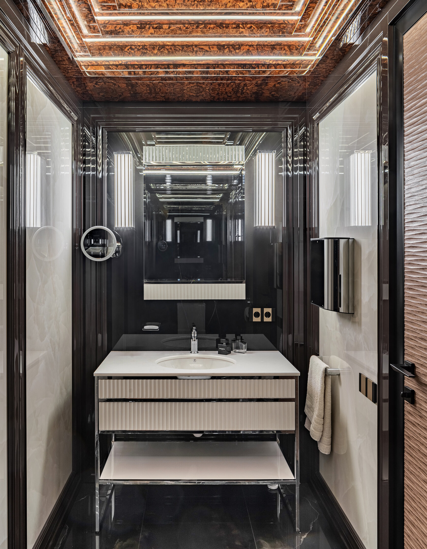 Кухонные фасады и стойка ресепшен выполнены из шпона эвкалипта и эбенового дерева файнлайн с декоративными рифлеными вставками — всё в исполнении мастеров компании INTERIO GRAND, которая специализируется на производстве столярных изделий премиум-класса уже многие годы. На полу в кабинете уложен итальянский керамогранит глубокого черного цвета с фактурой мрамора. На стенах — краска с эффектом состаренной штукатурки, напоминающей стены старинных виноделен. В дизайне потолков сочетаются встроенный свет, деревянные детали, современные натяжные конструкции и перфорированные панели.