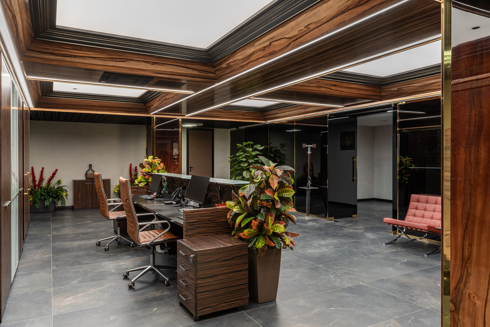Когда респектабельный дизайн и роскошные материалы отделки становятся главными составляющими проекта? Разумеется, когда главная цель интерьера — произвести впечатление. Дизайнер Андрей Проценко совместно с INTERIO GRAND оформил представительский офис винодельческой компании площадью 500 м², где большая половина отведена для кабинета президента. Это открытое пространство с массивным письменным столом, комфортной переговорной, мягкой диванной группой и ТВ-зоной, а также демонстрационными витринами и чайной «комнатой». Структуру, симметрию и ритм в интерьере задали потолочные балки и колонны, отделанные шпоном и угловыми латунными вставками. Натуральная фактура дерева и благородный коньячный оттенок — дань культуре виноделия, отсылки к старинным дубовым бочкам, в которых выдерживают виноградный сок. Все деревянные отделки в офисе и корпусная мебель выполнены на заказ. Для кабинета были подобраны экзотические шпоны черепашьего дерева и американского ореха, красоту которых подчеркнула сияющая лаковая поверхность.